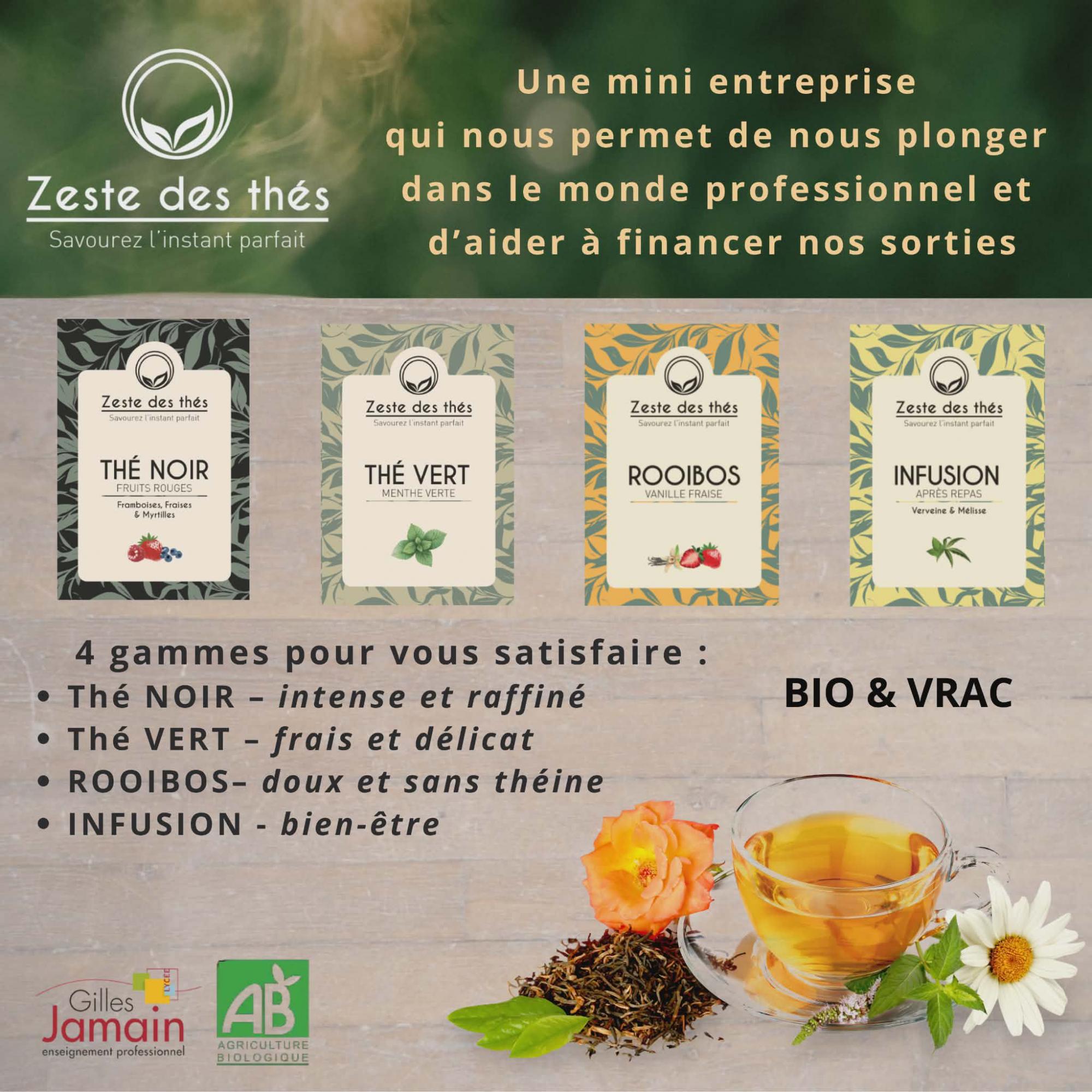 | Les élèves de 1ère Bac Pro Commerce et Vente vous invite à découvrir leur marque "Zeste des thés" lors des Journées Portes Ouvertes.